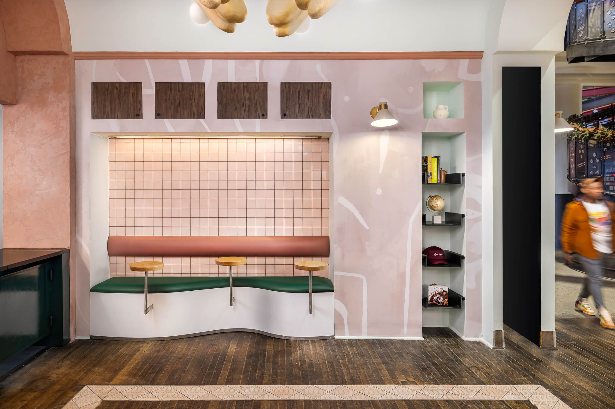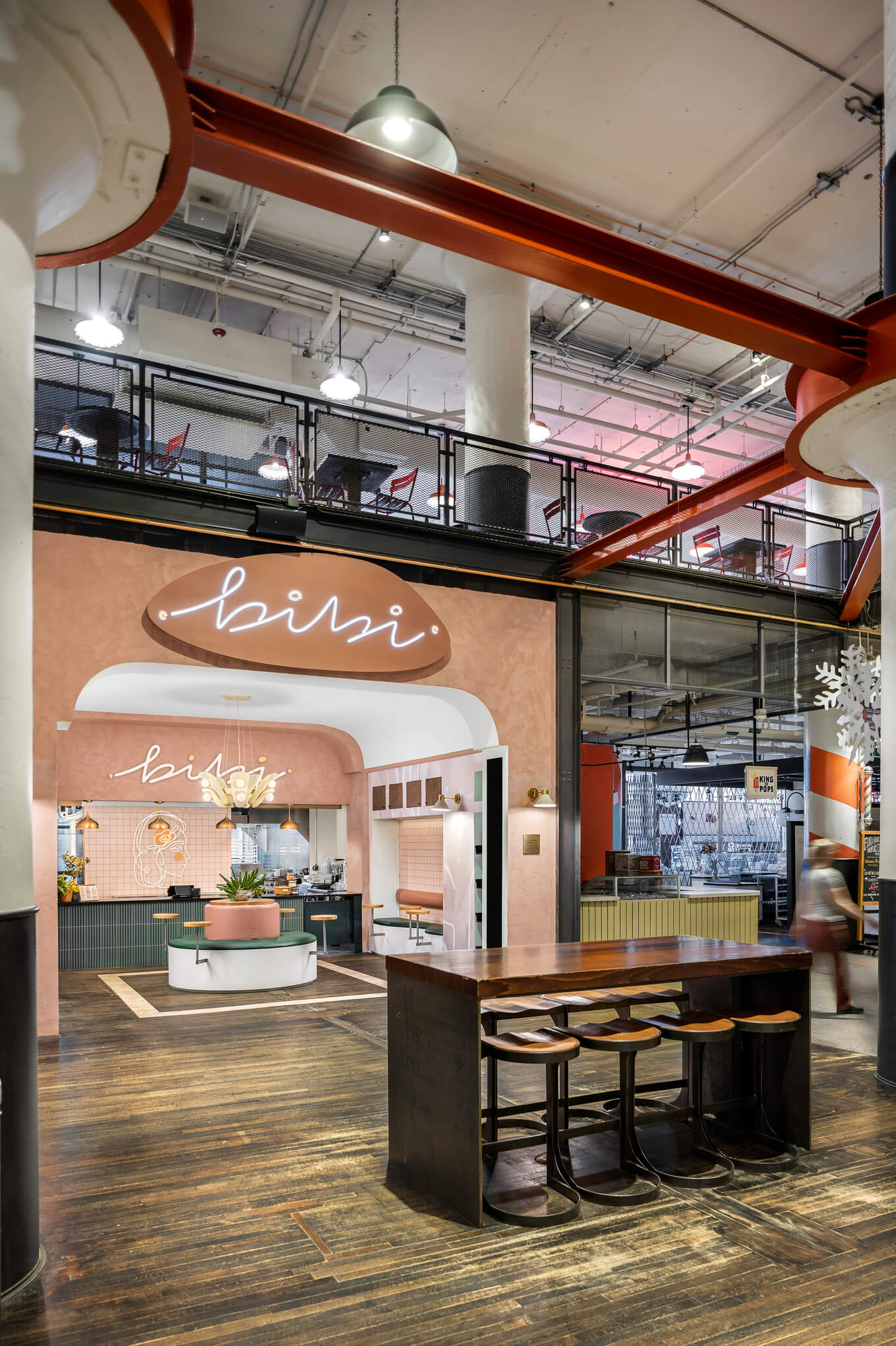 Bibi Eatery is a fast-casual restaurant interior design project in Atlanta's Ponce City Market, from the same team behind Delbar. Where Delbar is intimate and evening-driven, Bibi is bright, playful, and built for the pace of a food hall. The design takes inspiration from traditional Iranian cuisine and culture, framing the entry and service counter with exaggerated staggered arched portals that create a sense of theatre and arrival within a compact footprint. Pink tiles, teal banquettes, warm timber, and lush planting give the space a personality that's unmistakably its own while nodding to its sibling across town. Bibi proves that fast casual doesn't have to mean forgettable, delivering a design with character and charm that holds its own in one of Atlanta's busiest food destinations.