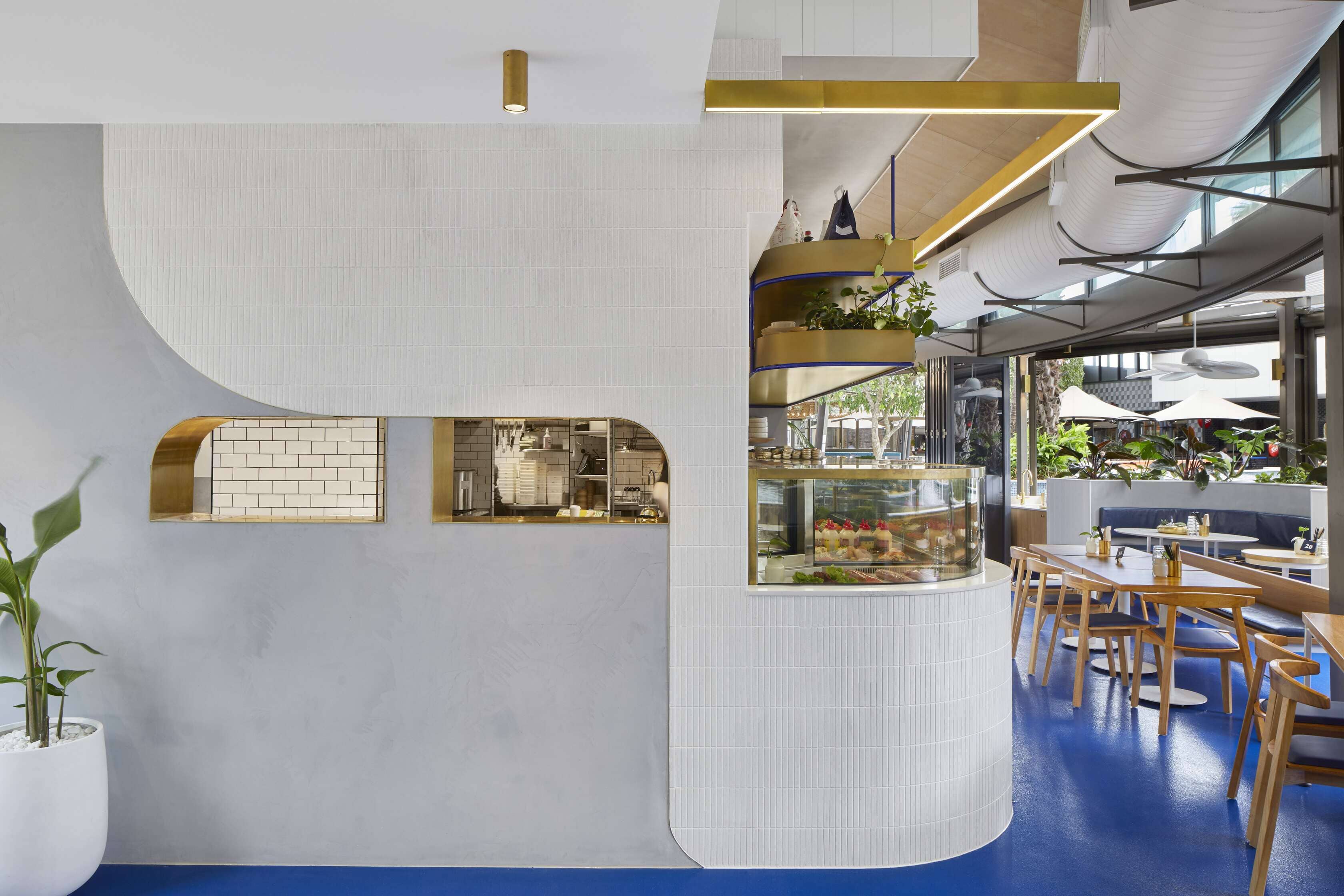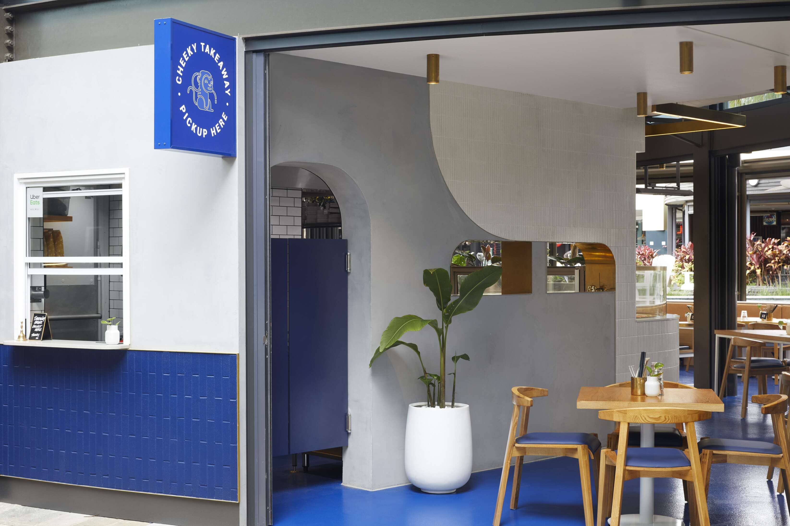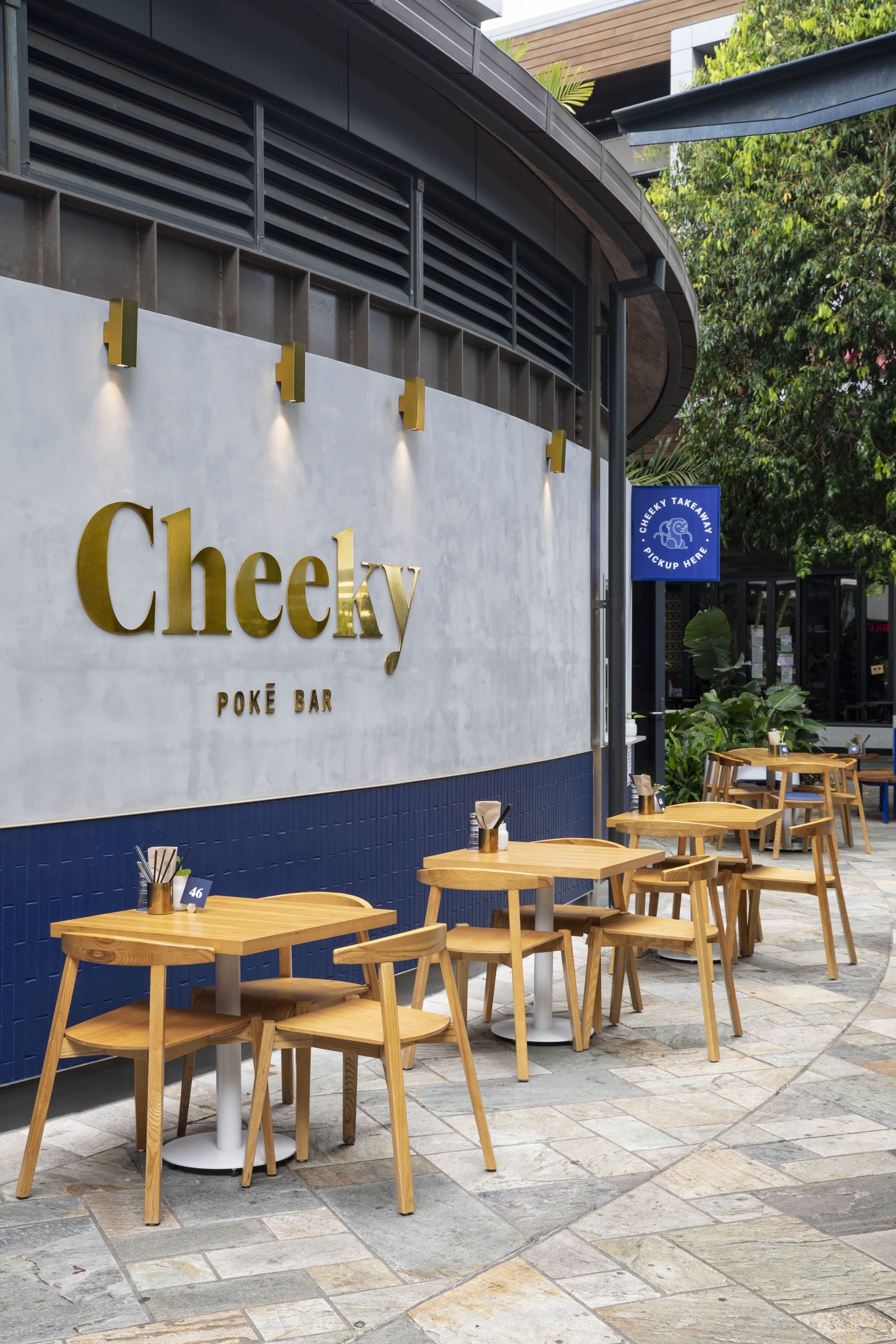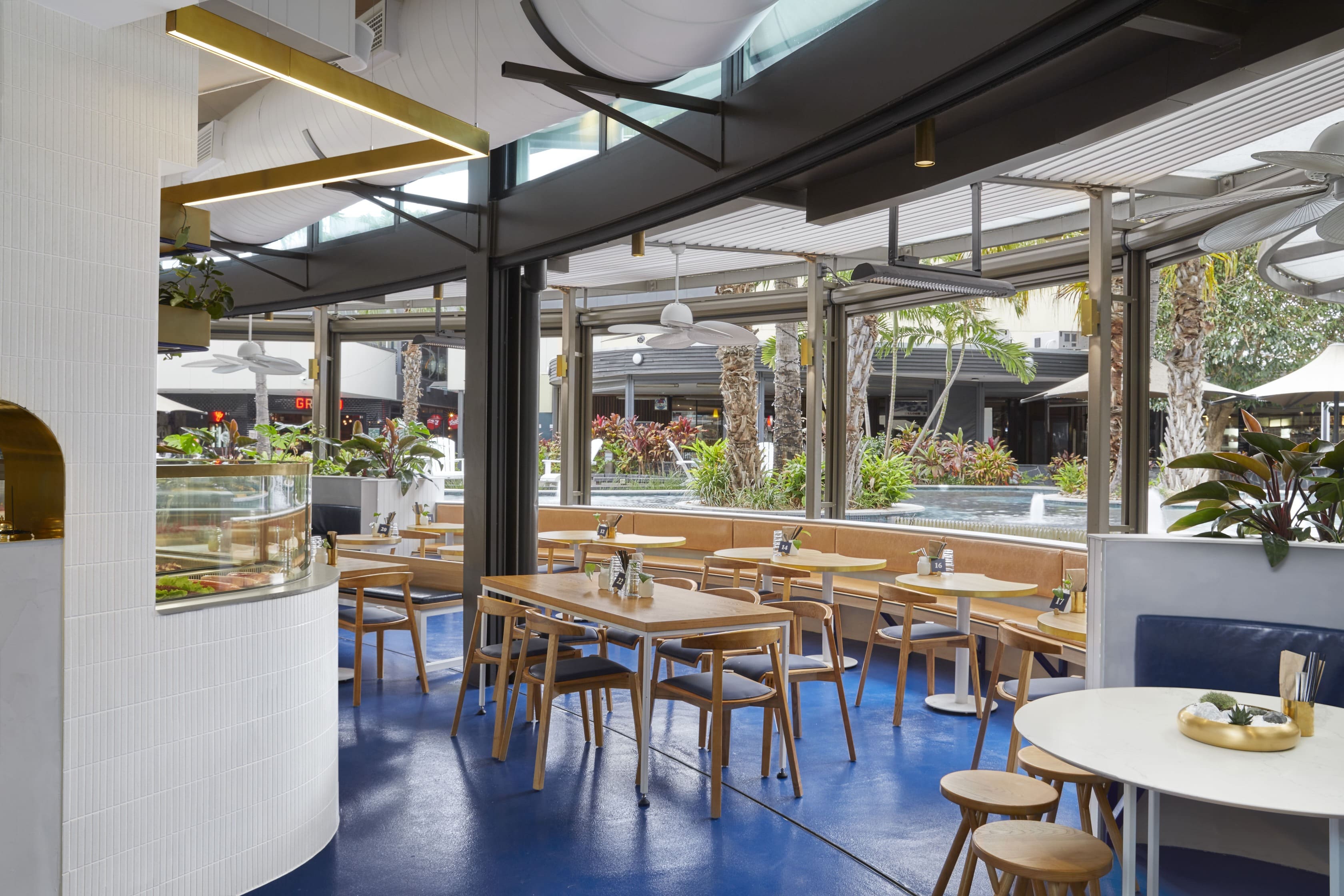 Cheeky Poke Garden City is a fast-casual restaurant interior design project in Brisbane's Garden City shopping centre. The spatial layout anchors an open kitchen and bar at centre stage, letting the energy of preparation ripple into every corner of the space and reinforcing the Cheeky Poke ethos of transparency and inclusivity. While the brand DNA carries through from the West Village location, each venue is given its own identity and point of difference. Concrete, timber, signature blue accents, and curved booth seating create a space that's unmistakably Cheeky Poke while standing confidently on its own.