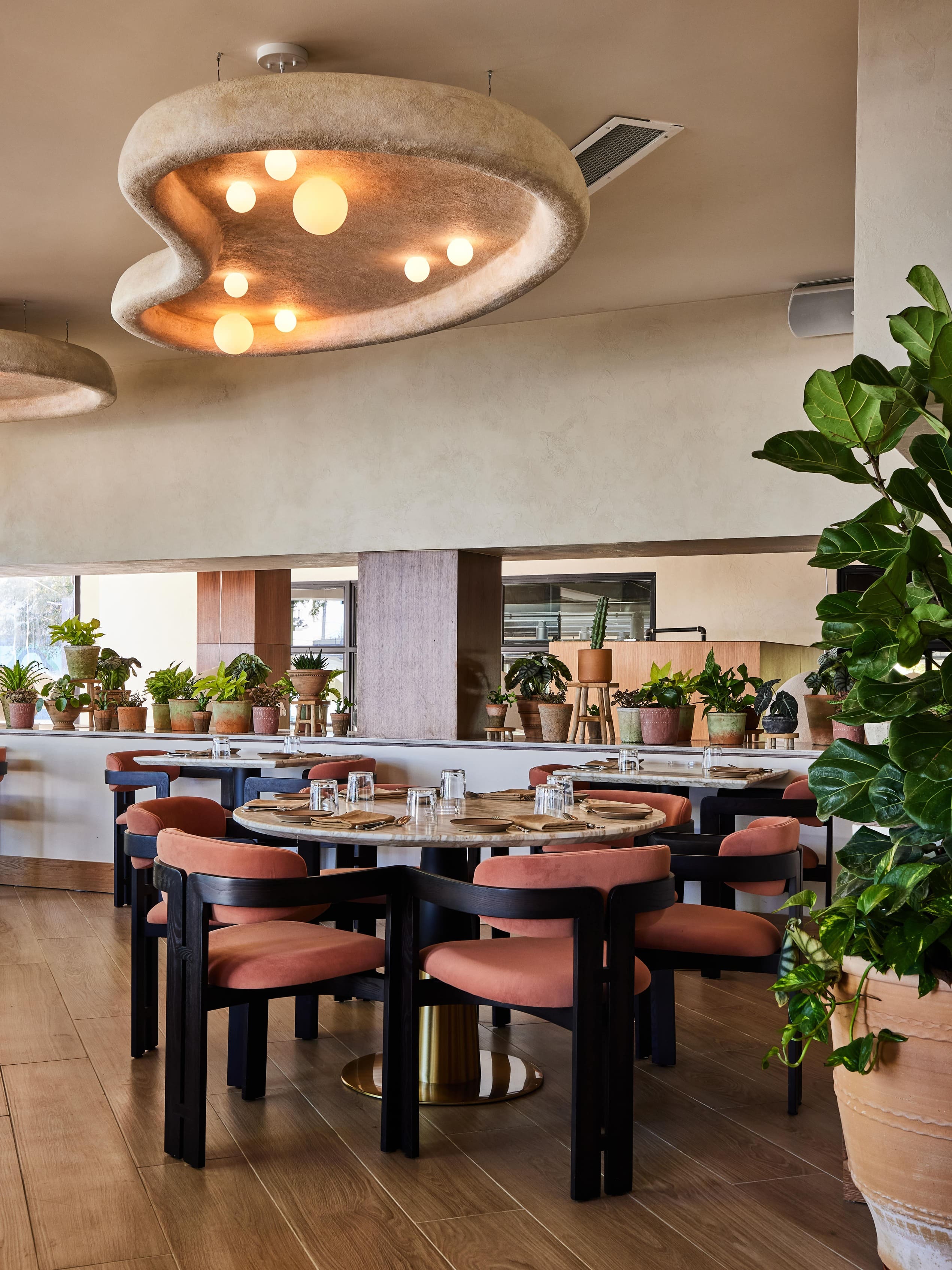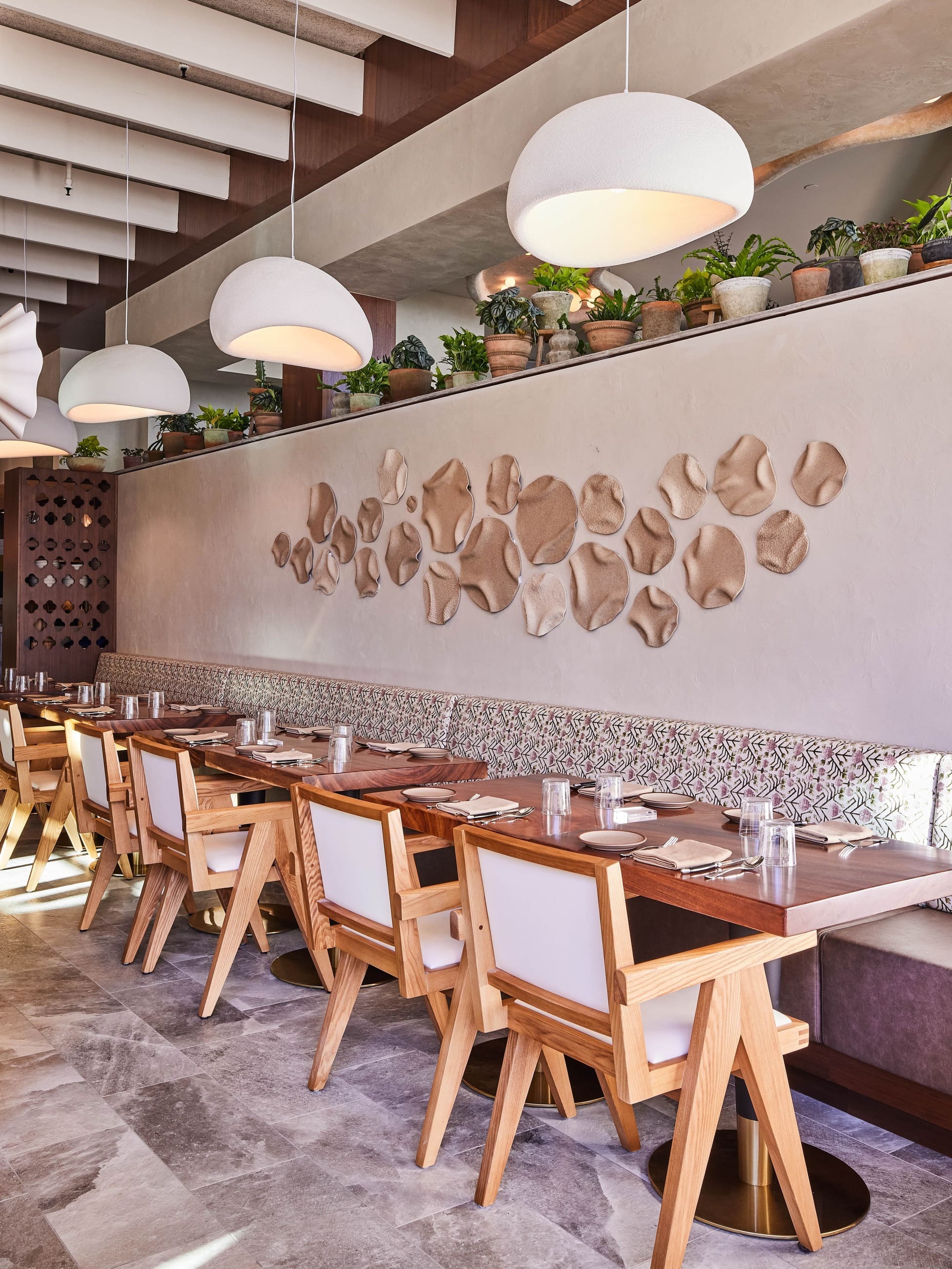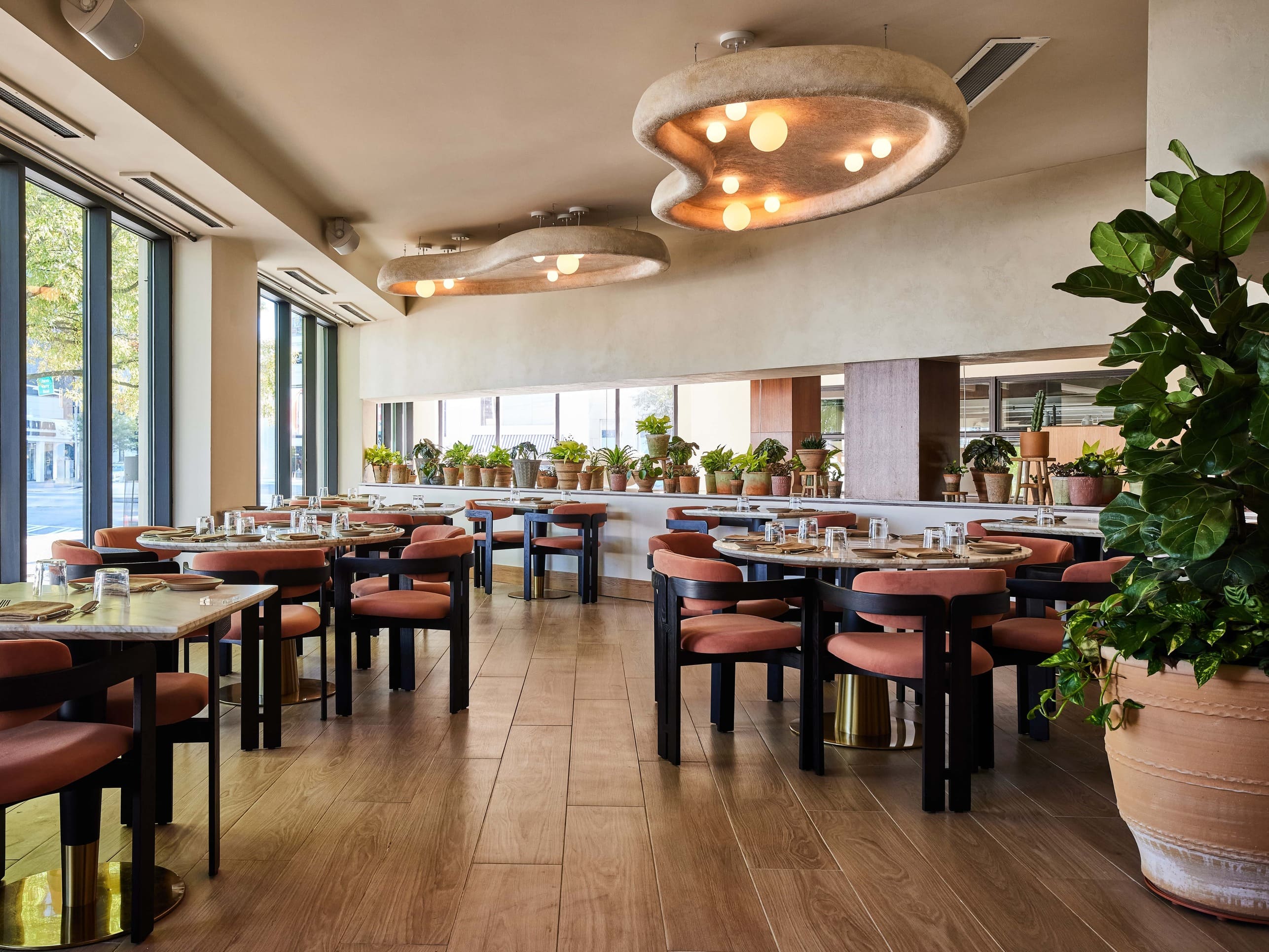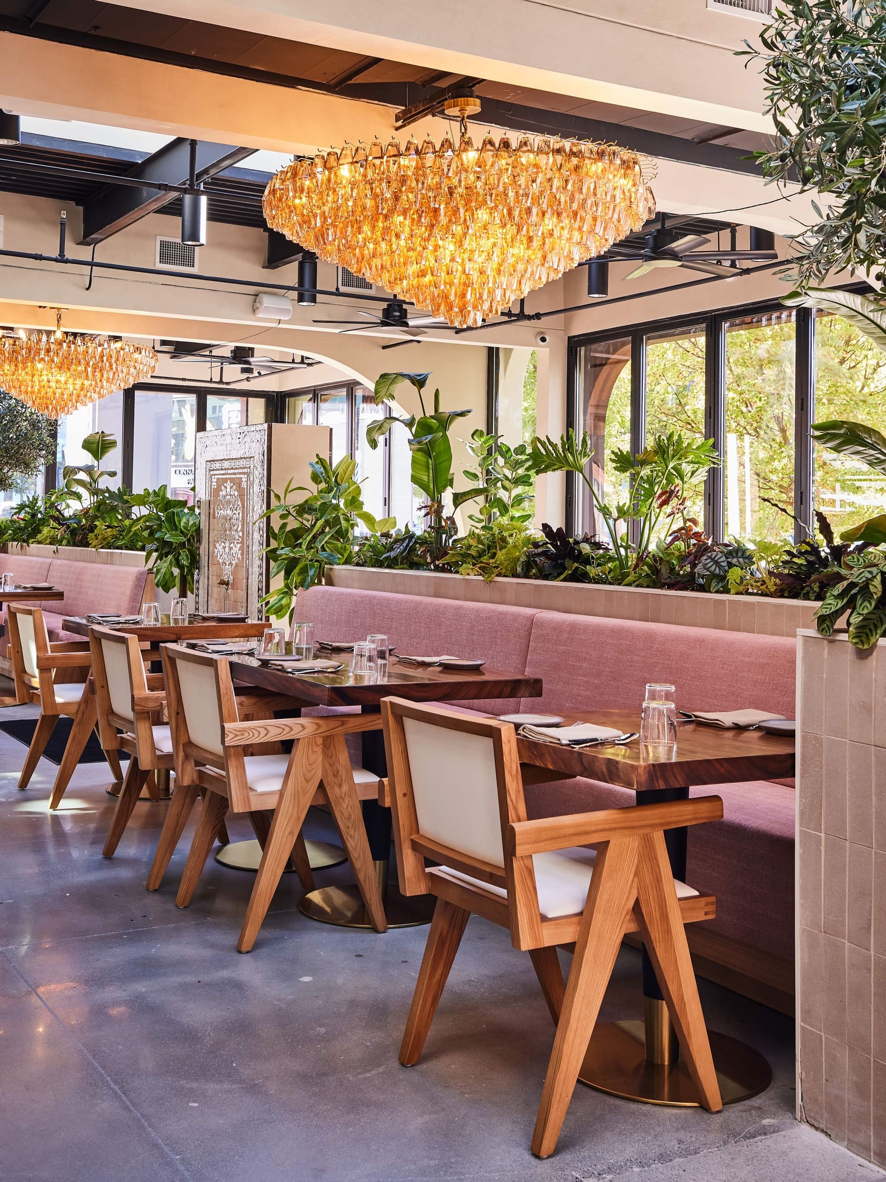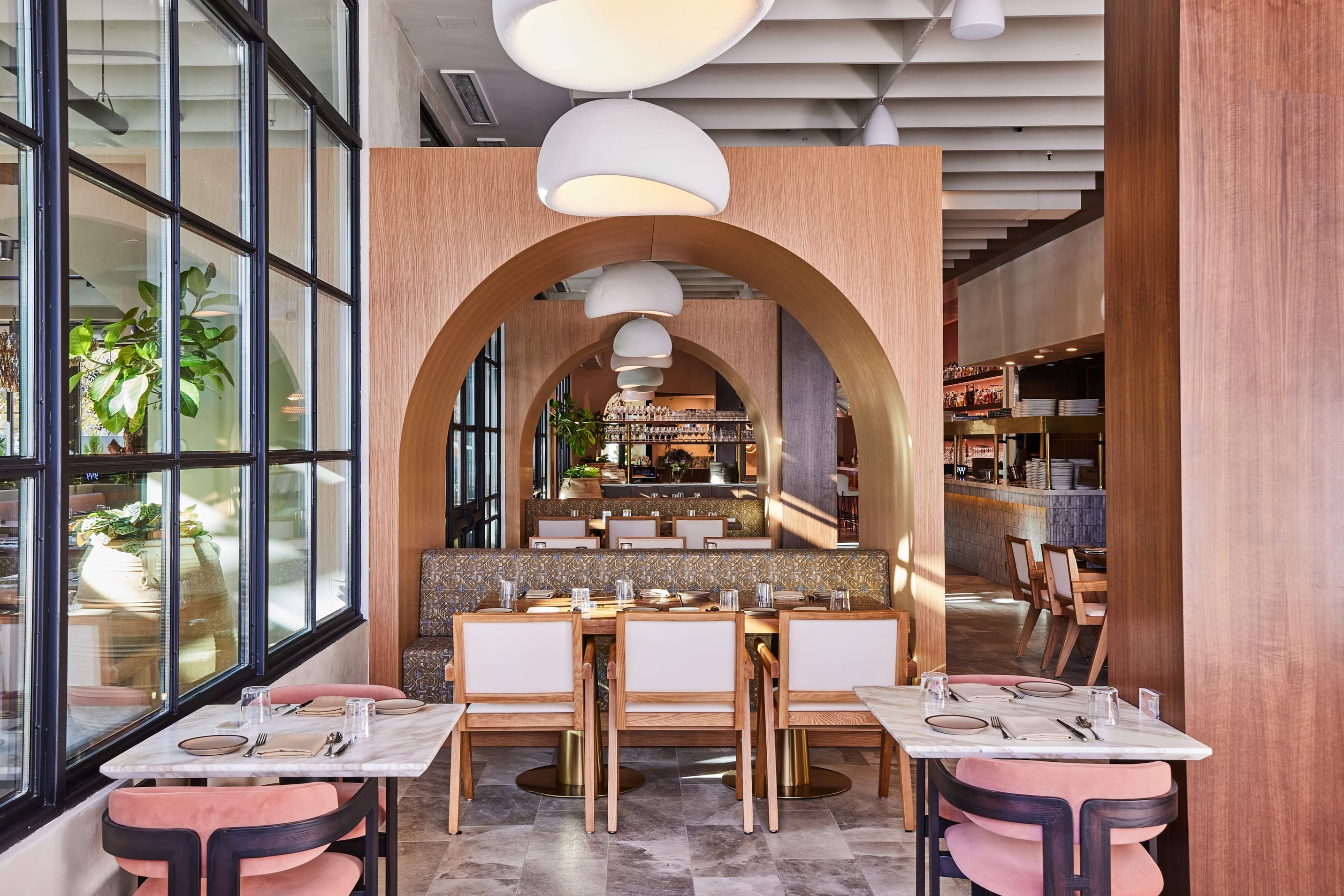 Delbar Buckhead is a restaurant interior design project in Atlanta's Buckhead neighbourhood, combining Middle Eastern charm with modern elegance. The design draws from Persian hospitality traditions, layering wood archways, hand-glazed tiles, courtyard fountains, and ornate lighting to create a space that feels authentically rooted without relying on cliché. A blush-toned bar, open kitchen, lush greenery, and intimate private dining areas give the restaurant a range of moods and experiences within a single venue. The palette is warm and enveloping, with soft pinks, rich timbers, and sculptural wall details that reward a second look. Delbar has quickly established itself as one of Atlanta's most distinctive dining interiors, proving that cultural storytelling and contemporary design can sit beautifully together.