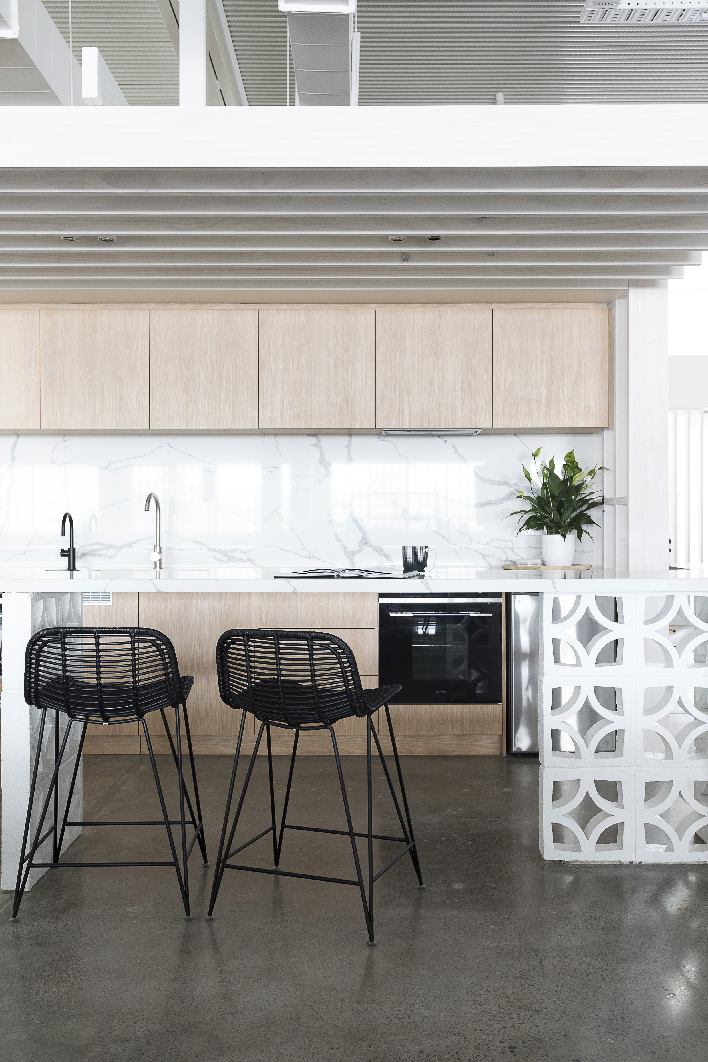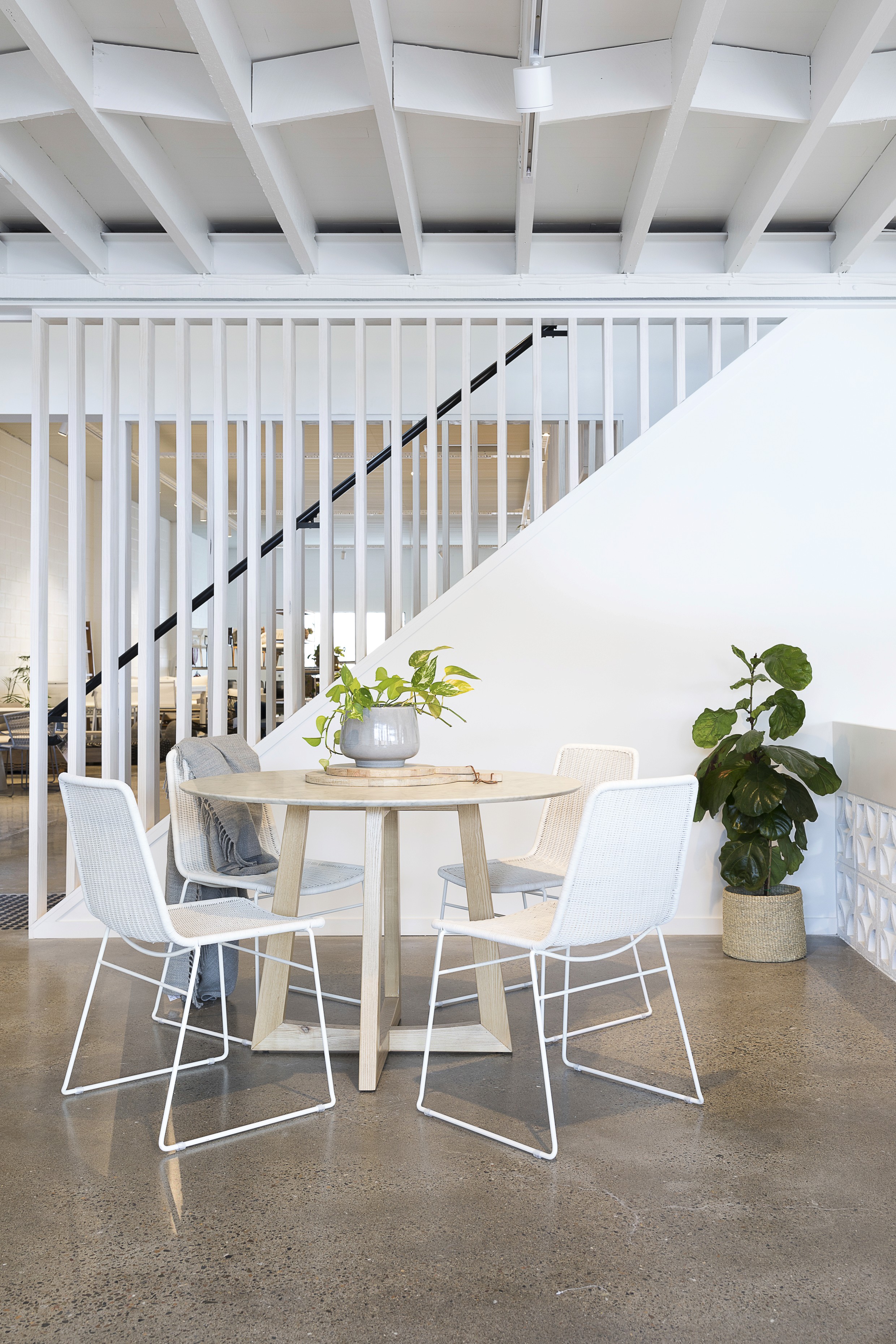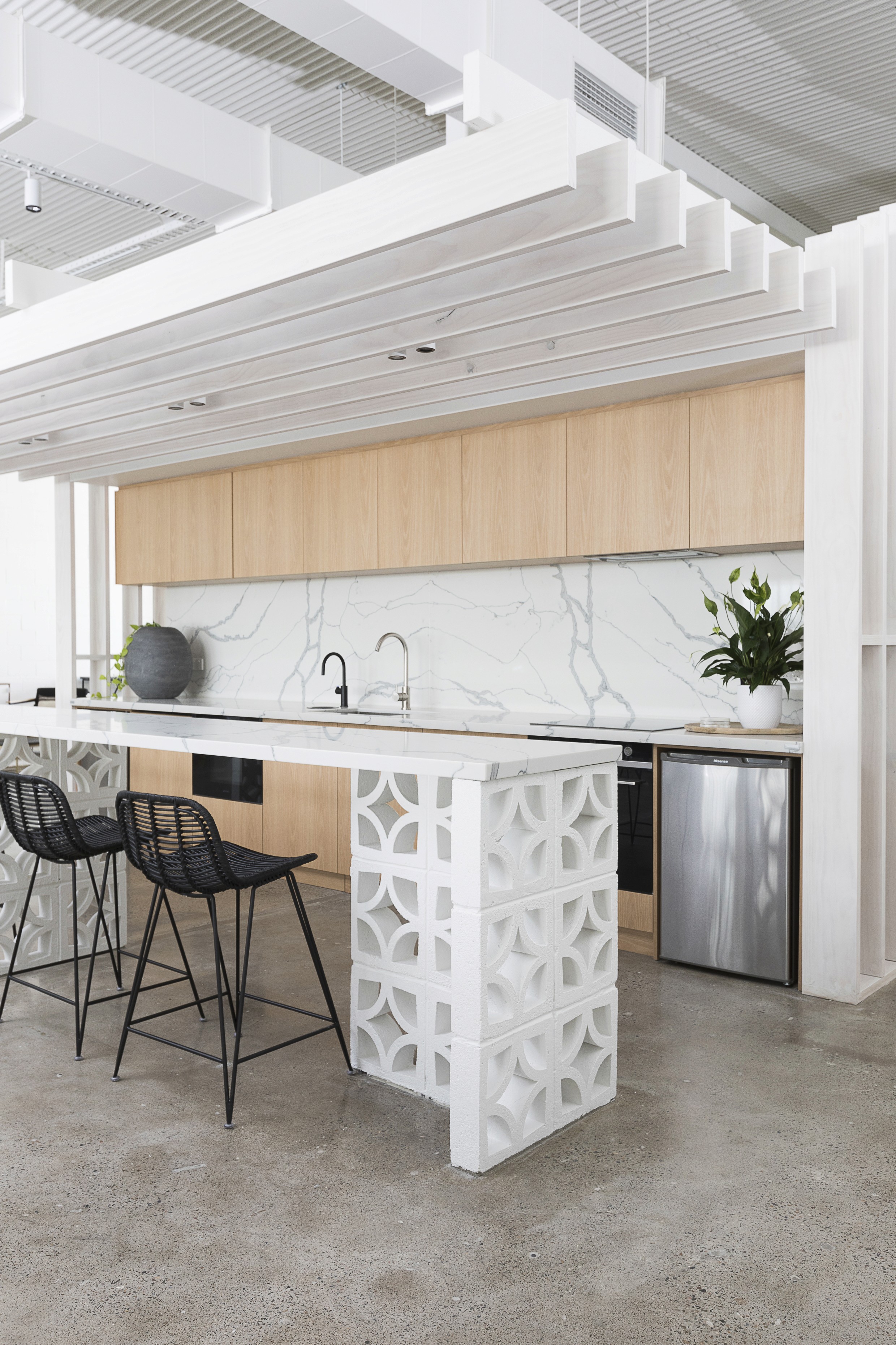 GlobeWest Brisbane is an interior design project for the Australian furniture brand's headquarters and showroom. The design uses a restrained natural palette of whites, timbers, and concrete to let the ever-changing product range take centre stage. Pitched vertical timber battens wrap the building's core, concealing bathrooms, kitchen and storage while referencing the warmth and familiarity of home. The result is a space that functions as both a working office and an evolving showroom, where the architecture steps back and the product speaks.