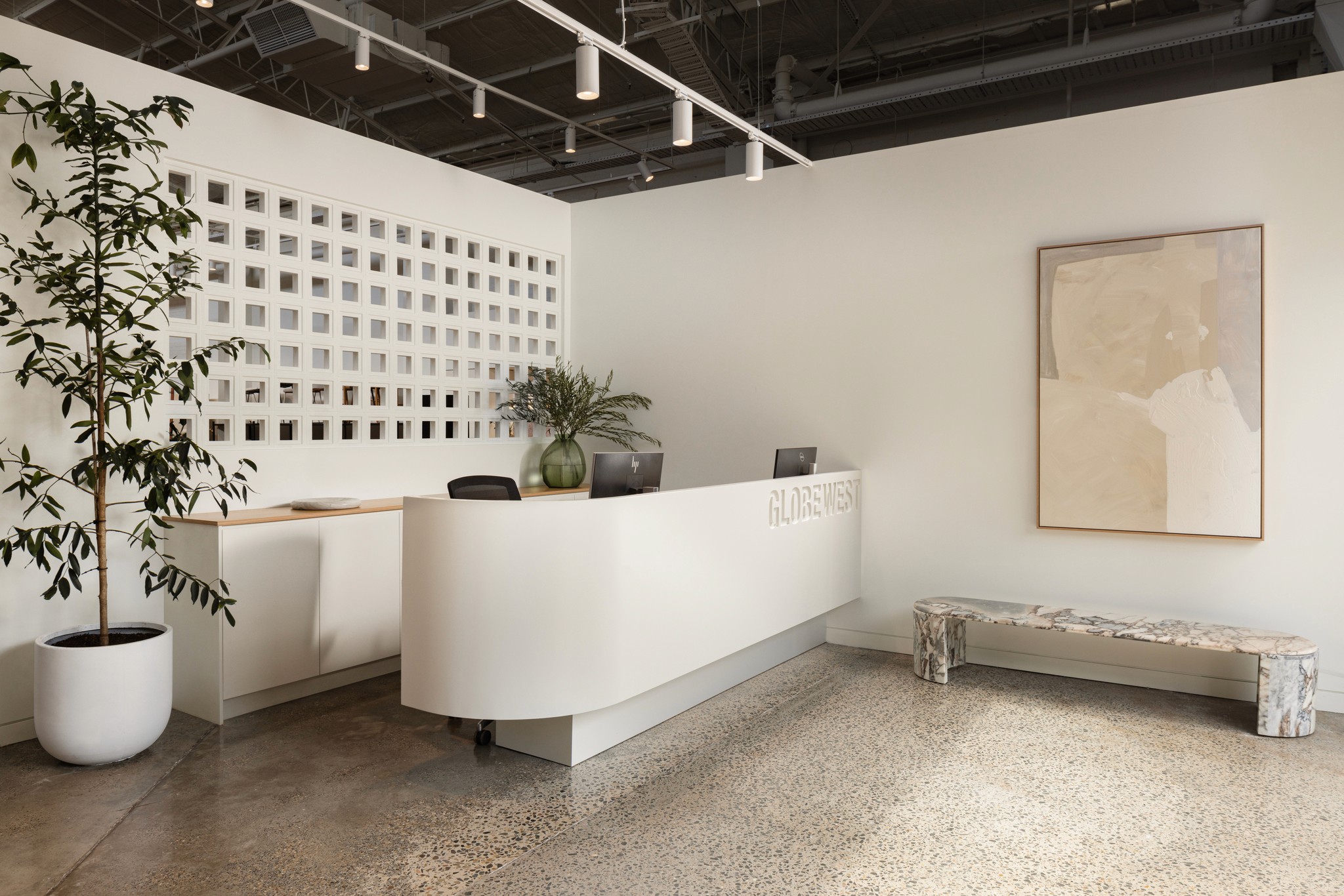 The open-plan showroom expertly showcases Globewest’s retail fixtures, aligning with both their product range and a carefully curated sales journey. Elevated display platforms feature statement vignettes, while partition screens define key zones, allowing for an intuitive and engaging user journey throughout the space. Monolithic forms at the reception and kitchen anchor the expansive space, with modular display units lining the walls to accentuate the building’s verticality. The result is a sophisticated, fluid environment that balances visual impact with functional design.