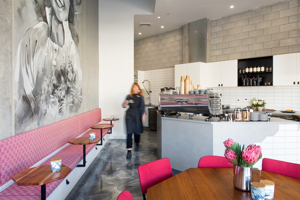 With Lola painted high on the raw concrete wall, the interior is layered with stories and personal touches that ensure the space is meaningful and rich in personality and character. Placing white tiles on raw concrete, alongside clean oak joinery and white cabinetry, the interior is fresh and refined and feels open and inviting despite being small in overall size.