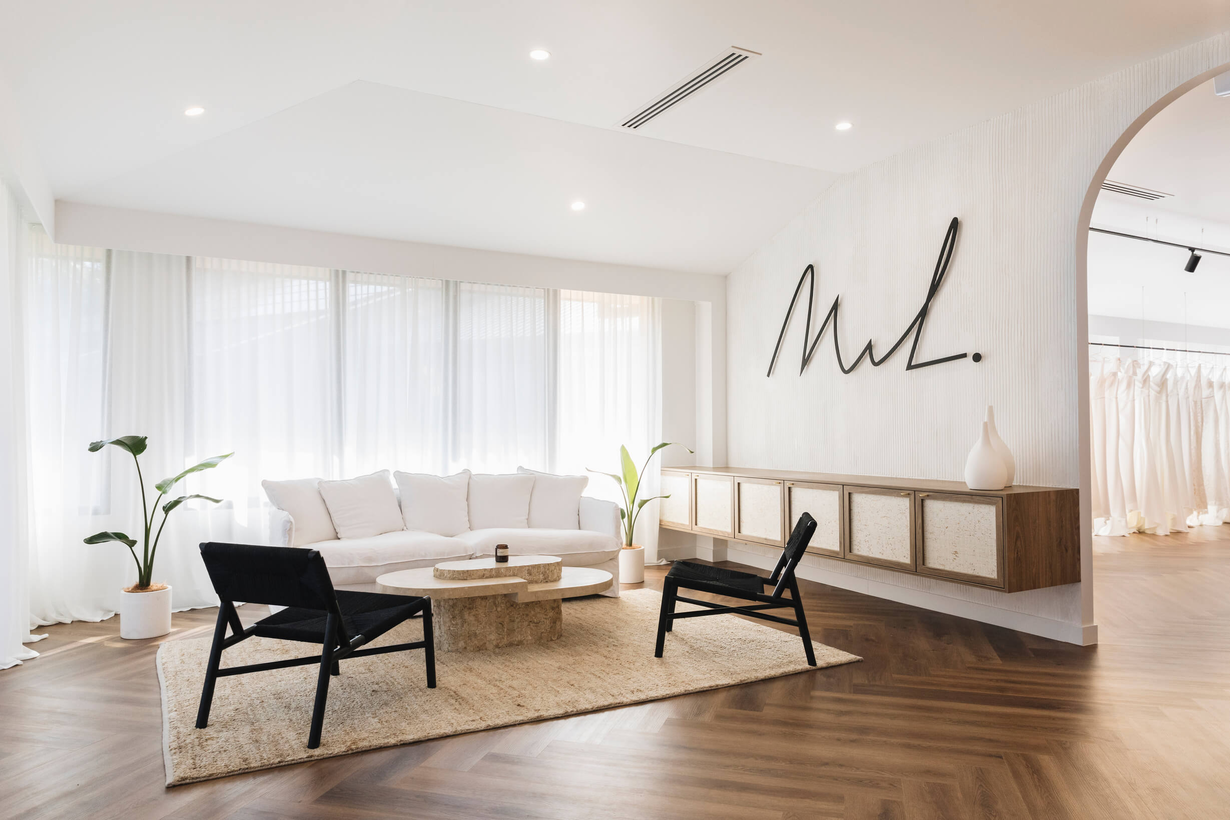 Spatial interventions were key in ensuring guests were choreographed so to absorb the space sequentially, enhancing the Made With Love experience. A staggered entry allows brides a moment of pause prior to emerging themselves in the shopping experience – guests then swirl past a sweeping travertine bar to collect a glass of celebratory bubbles before perusing the line of gowns that filter natural light throughout the space. A lavish fitting room, bridal podium and photography backdrop then conceal the Made With Love HQ that inconspicuously neighbours the boutique, making the space hyper functional for business operations.