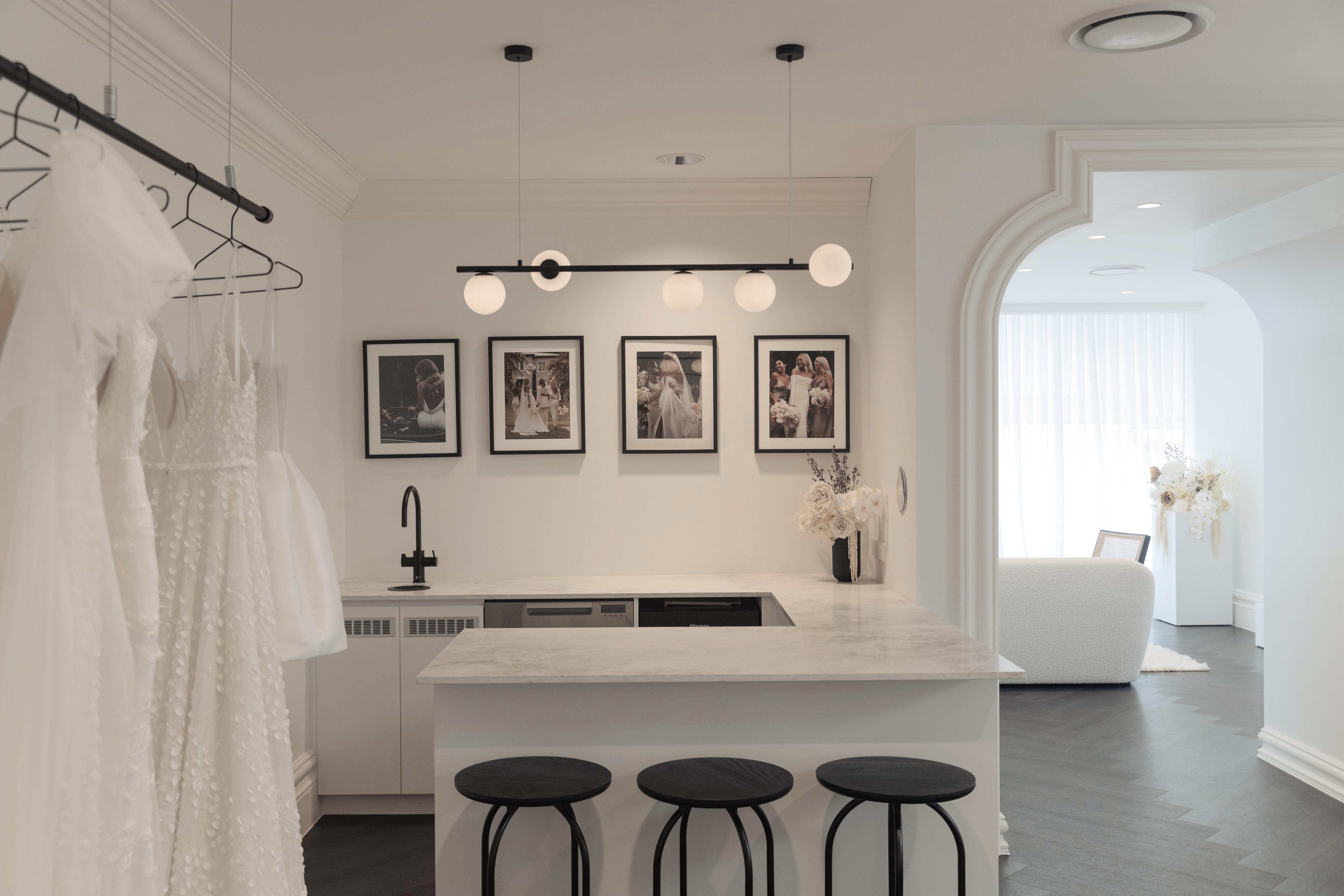 Made With Love Brisbane is a bridal boutique interior design project that choreographs the entire shopping experience from the moment a bride walks in. A staggered entry creates a moment of pause before guests emerge into the showroom, passing a sweeping travertine bar for a glass of celebratory bubbles before browsing the curated line of gowns. Sheer draping, dried florals, and soft natural light filter through the space, creating an atmosphere that feels romantic without being saccharine. A lavish fitting room, bridal podium, and photography backdrop sit seamlessly alongside the concealed Made With Love HQ next door, making the space as functional for business operations as it is memorable for clients.