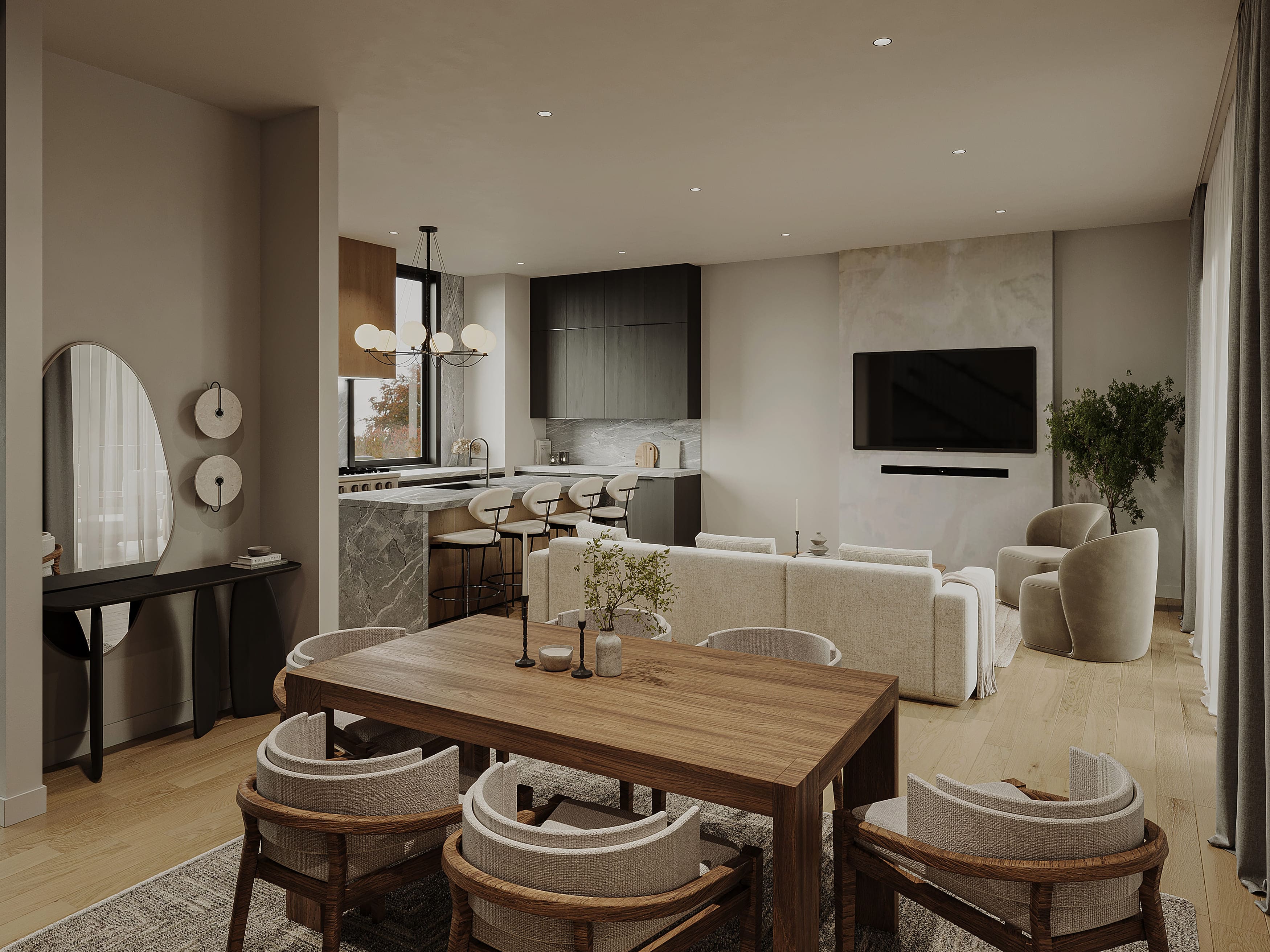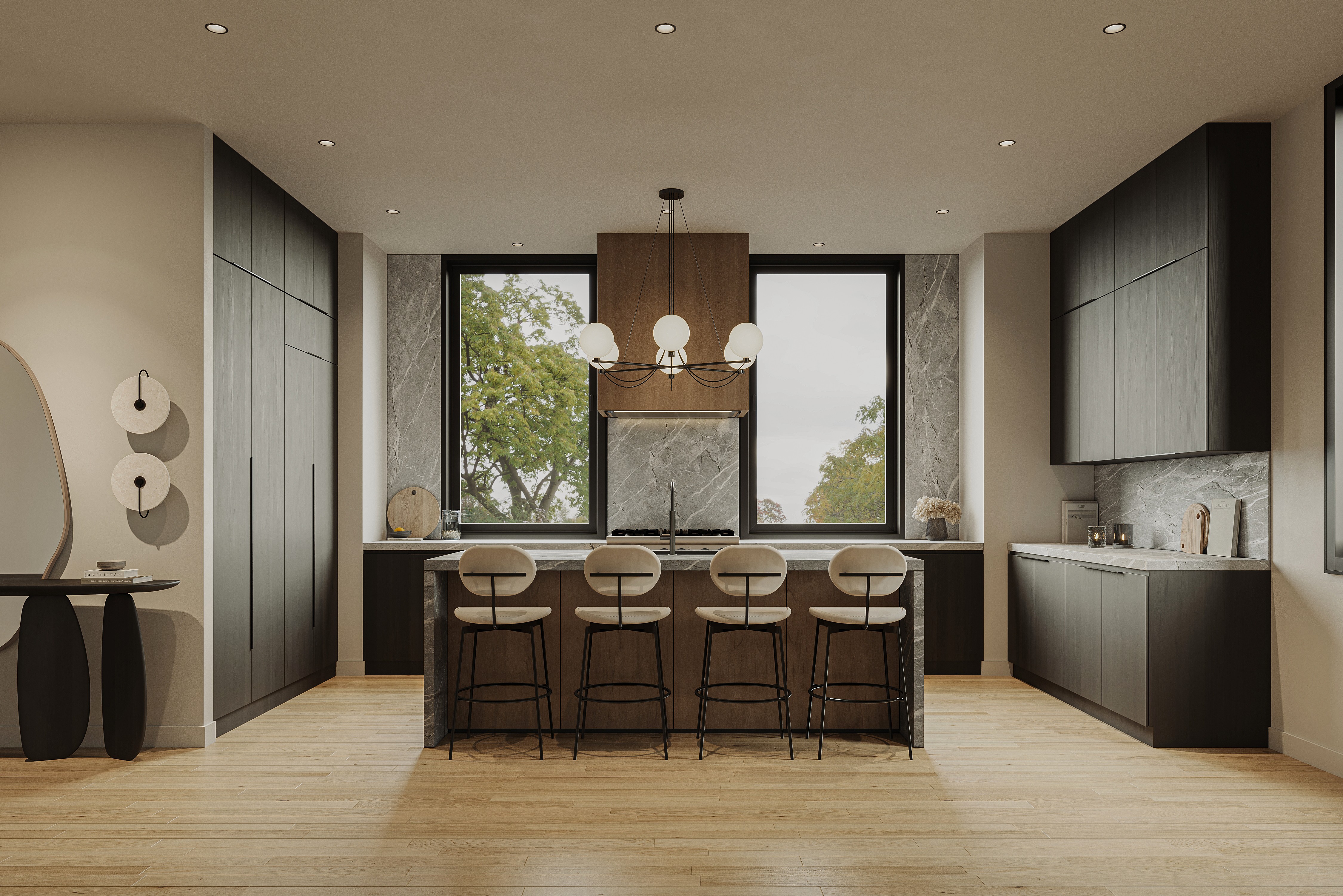 This four-level townhome development offers two interior schemes that balance urban vibrancy with calm comfort. Clean lines, muted palettes, and statement lighting create a sleek tone, while plush textures add warmth. Optional upgrades refine the design, blending metropolitan edge with everyday livability