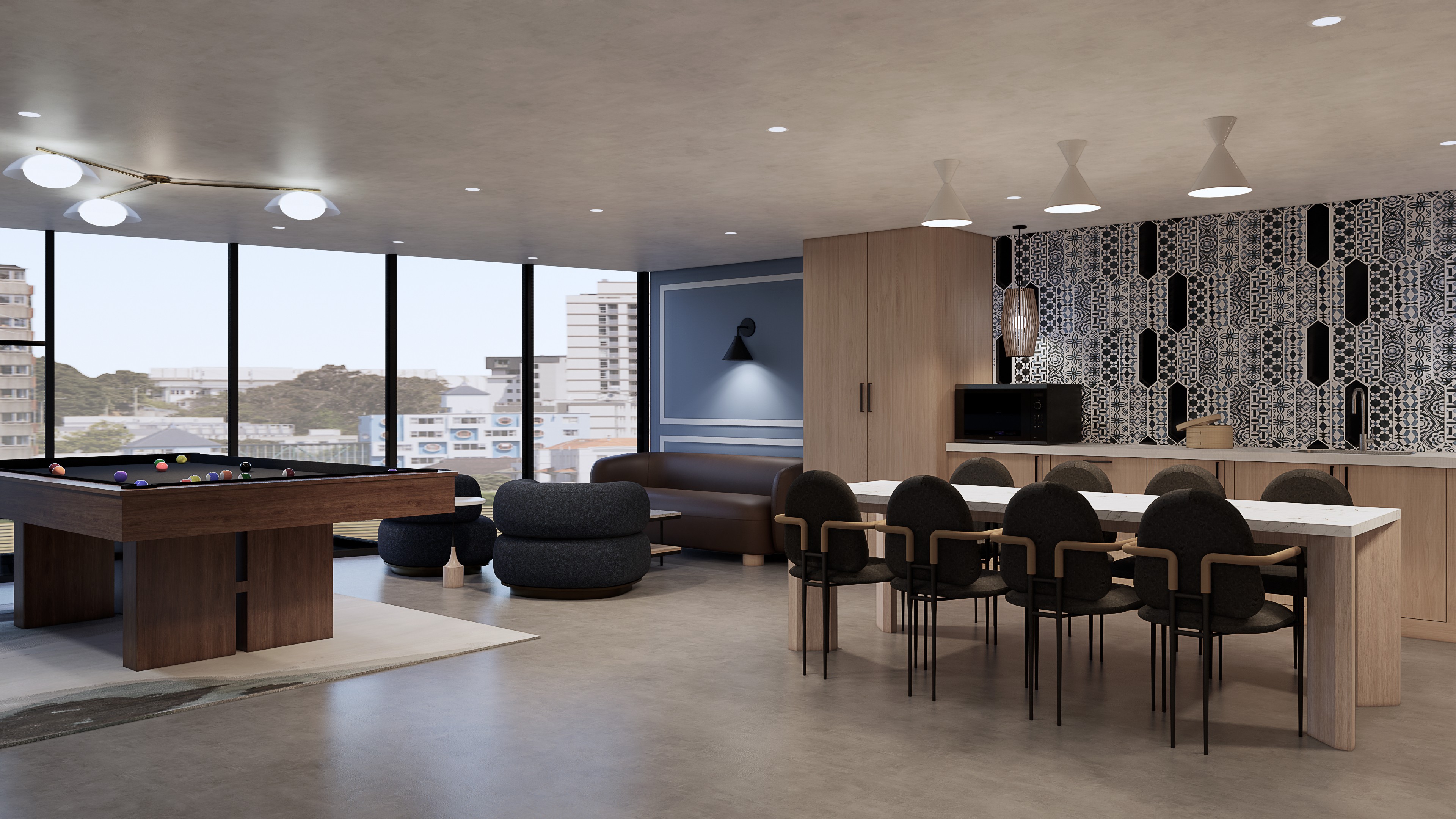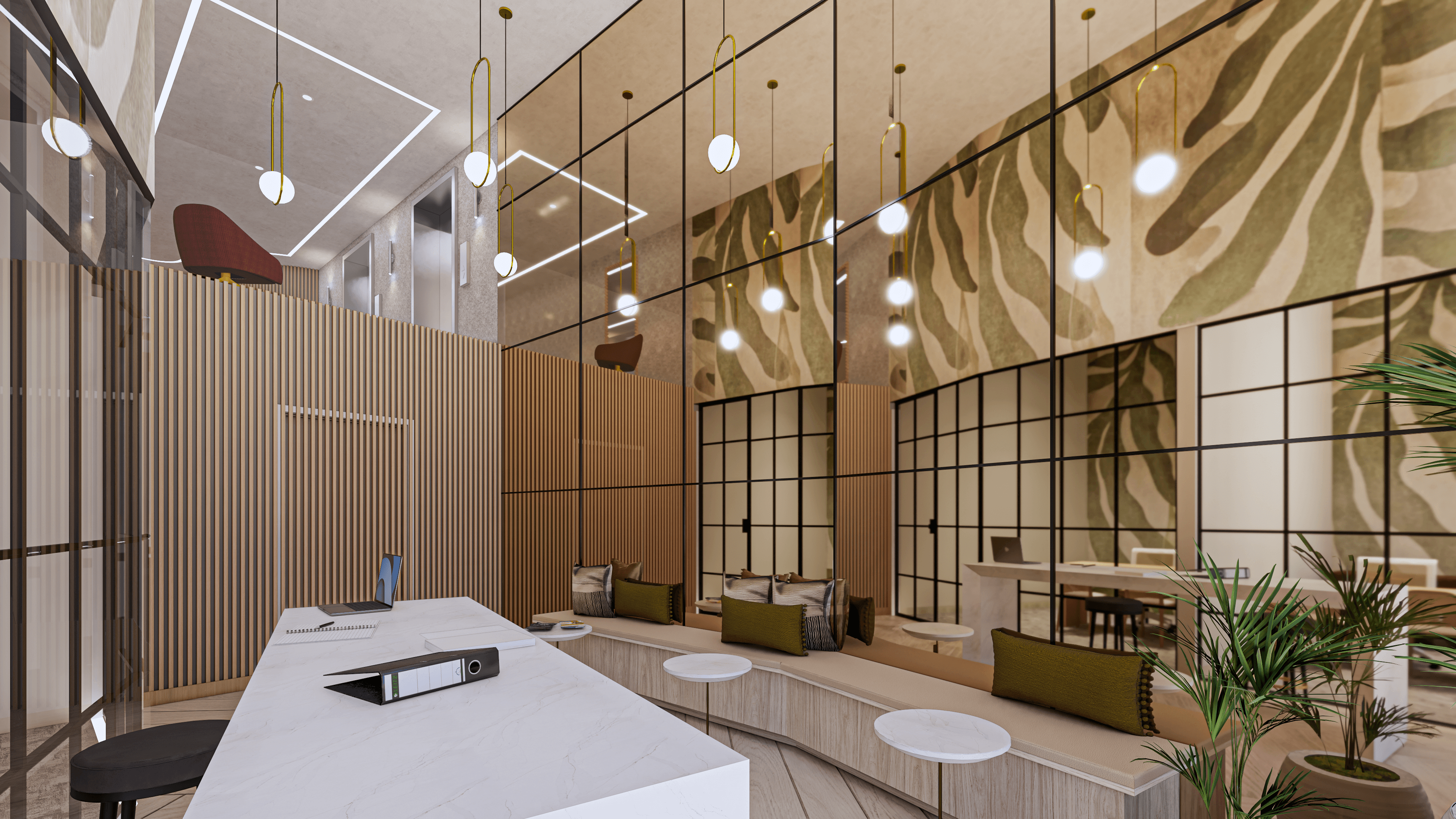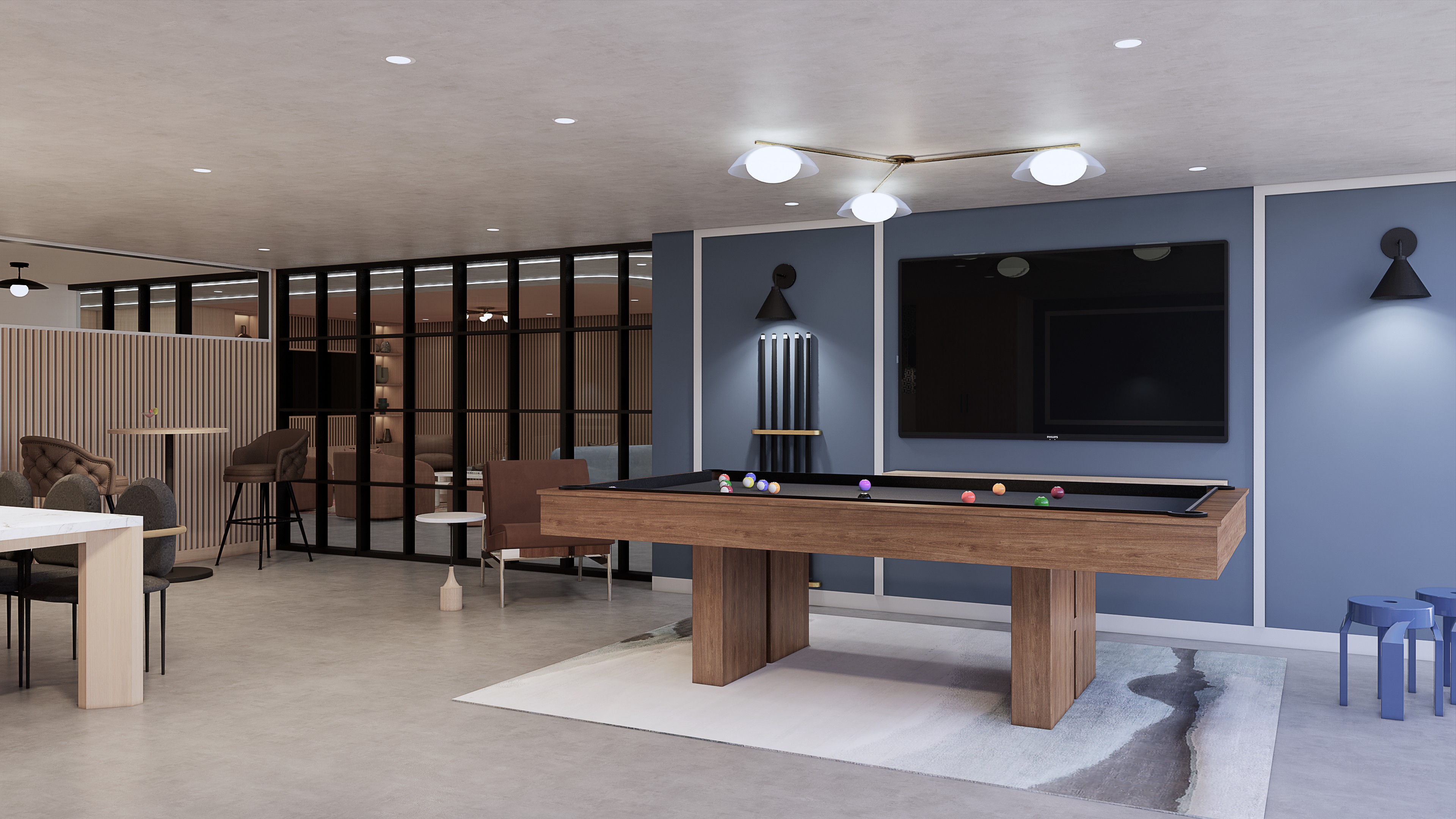 Parc Residence is a multi-family interior design project in Oakland Park, Florida. The amenity spaces are designed to feel more boutique hotel than apartment complex, with co-working zones, lounges, meeting rooms and social areas that balance warmth with sophistication. Timber screens, sculptural lighting, and a grounded material palette of rich burgundy, warm neutrals and textured finishes create a layered, residential atmosphere across every shared space. Each zone has its own character while reading as part of a cohesive whole, giving residents spaces that feel curated, not cookie-cutter.