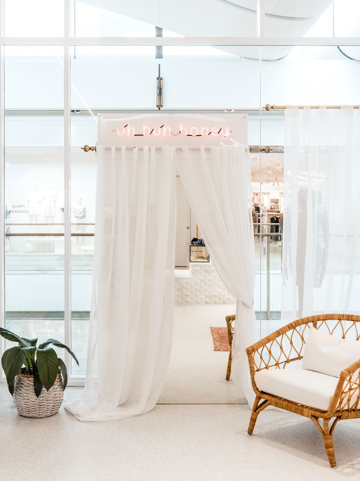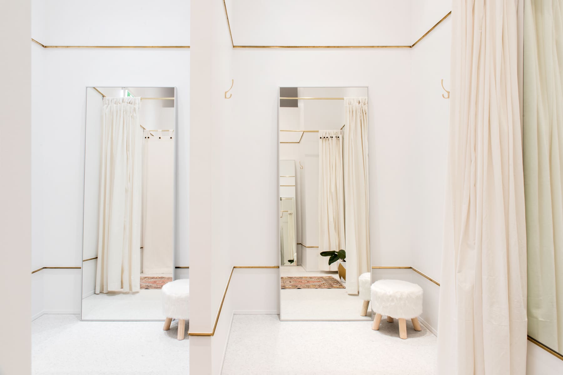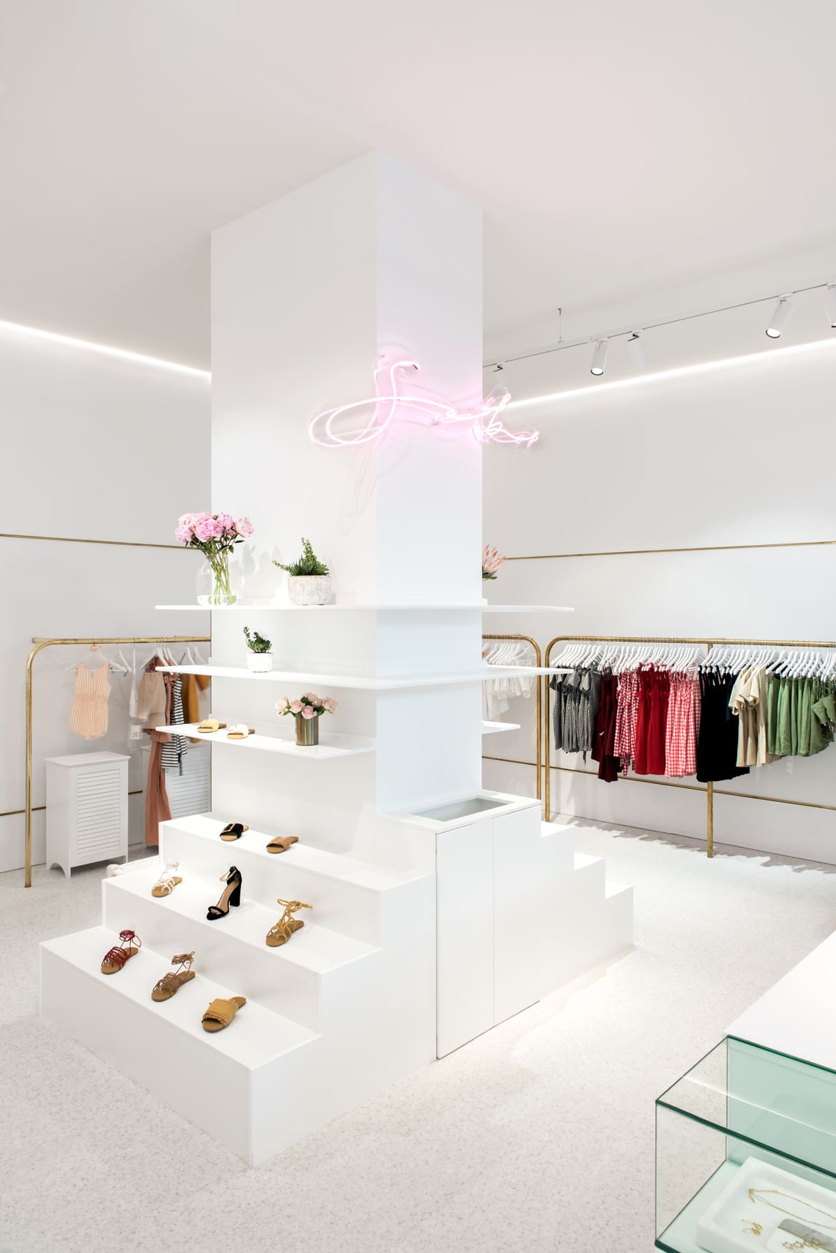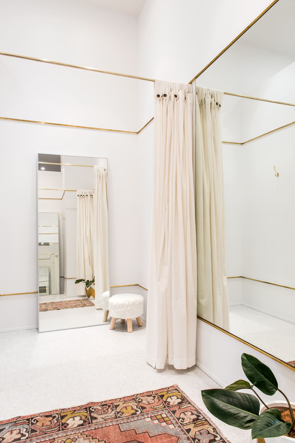 A breezy white and understated backdrop allows their product to shine, brass detailing exudes luxury and blush pink accents were delicately integrated throughout to soften the space.