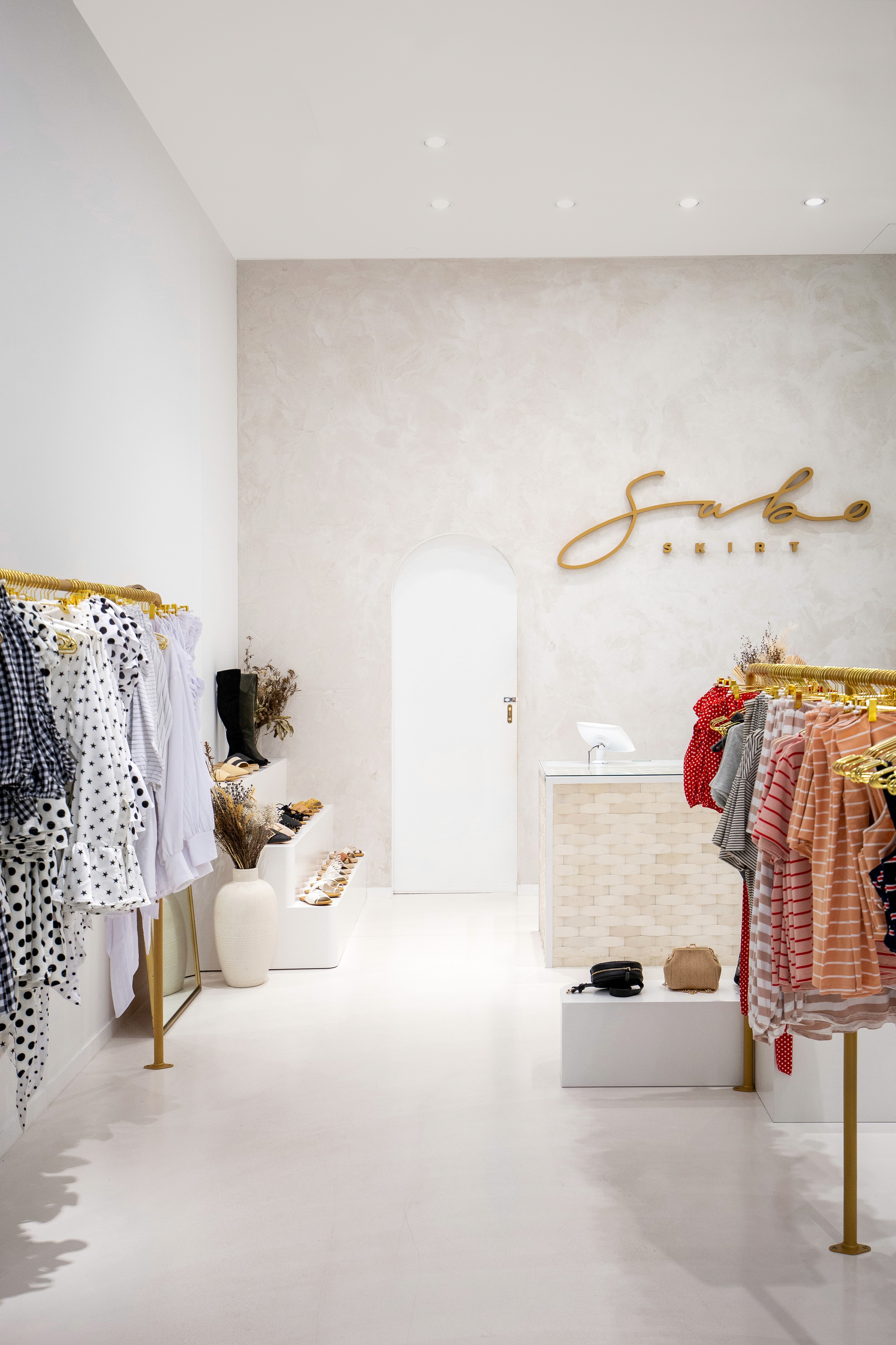 Walls bathed in bright whites, basket woven stone and brass detailing remain consistent. With the existing aesthetic and a textured pink feature wall was introduced as a point of creative difference. The execution of form within the space allows for a seamless integration of visual merchandising and navigation throughout the store. With white rendered arch motifs reminiscent of the brand’s Greek origins.