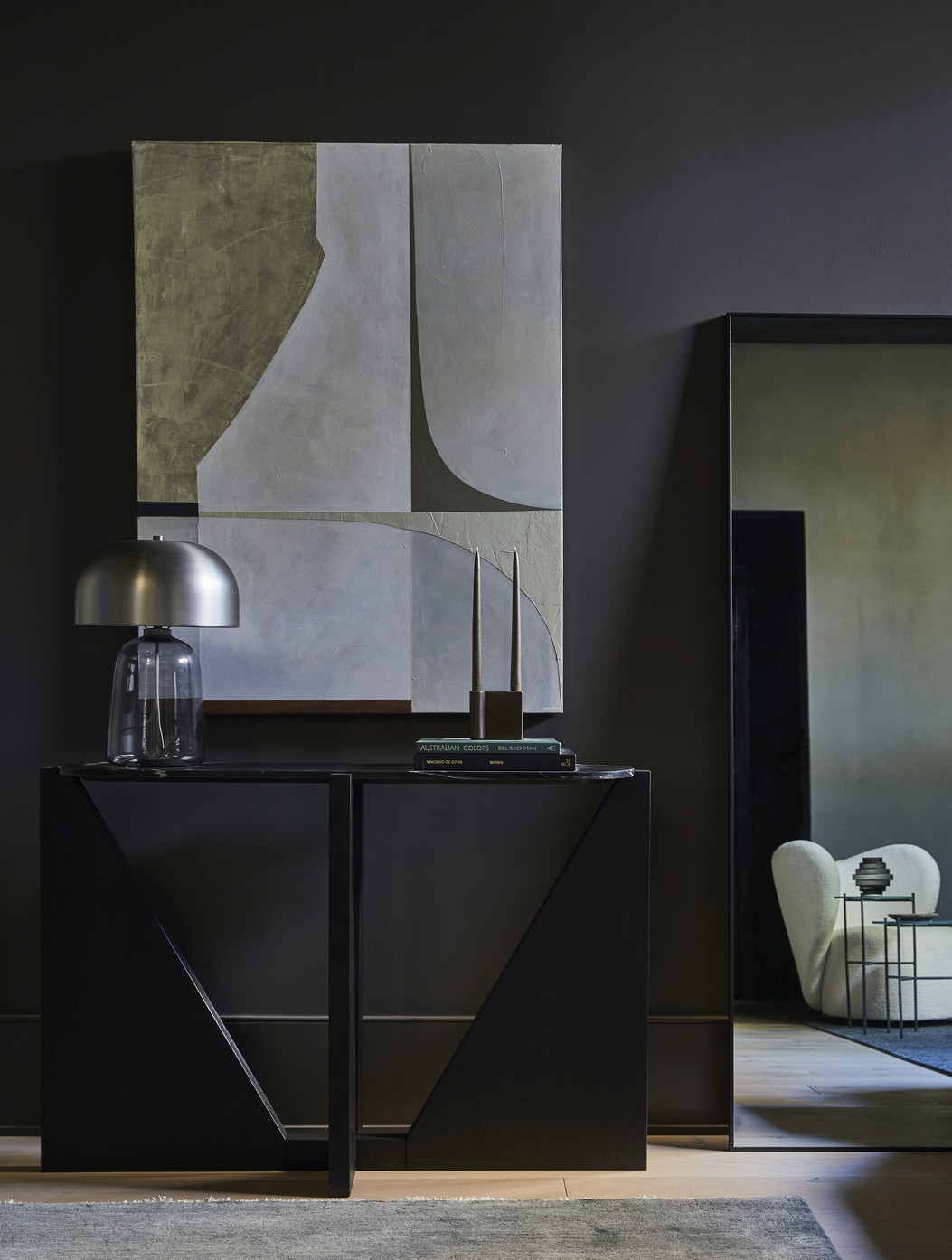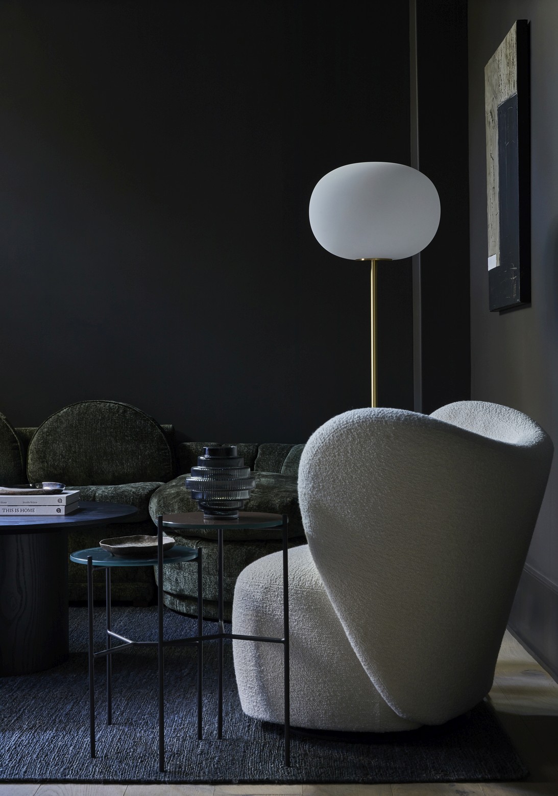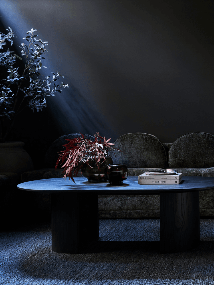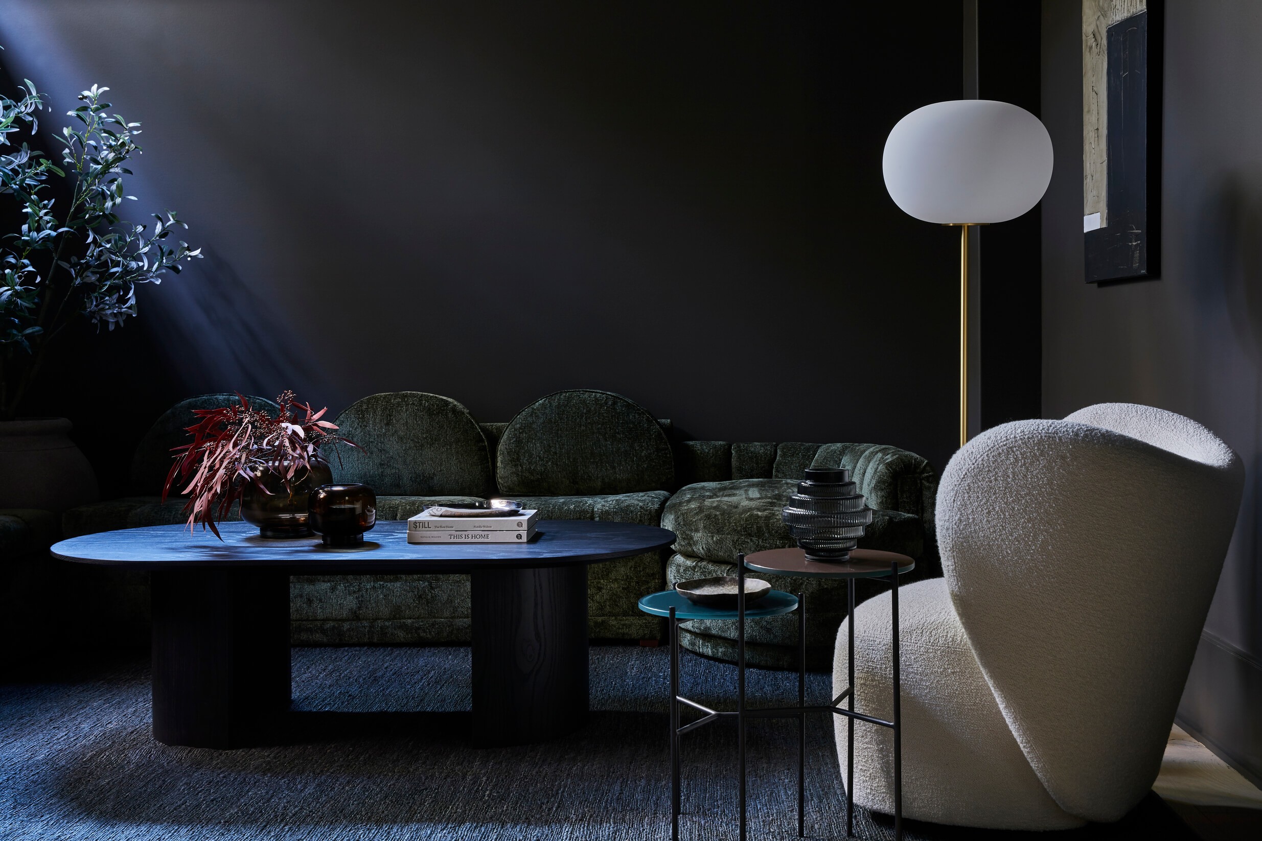 Dark walls and a custom dirty olive sectional set a moody tone, layered with textured rugs from Armadillo & Co and Jaipur and black wood tables from Bradley USA. A white Little Big lounge chair from Habachy, custom muted sage velvet bar stools, and muddy taupe glass sides tables offer a multitude of options to perch, sit or lounge on and admire the custom artwork by Stephen Shon & Sheyda Mehrara.