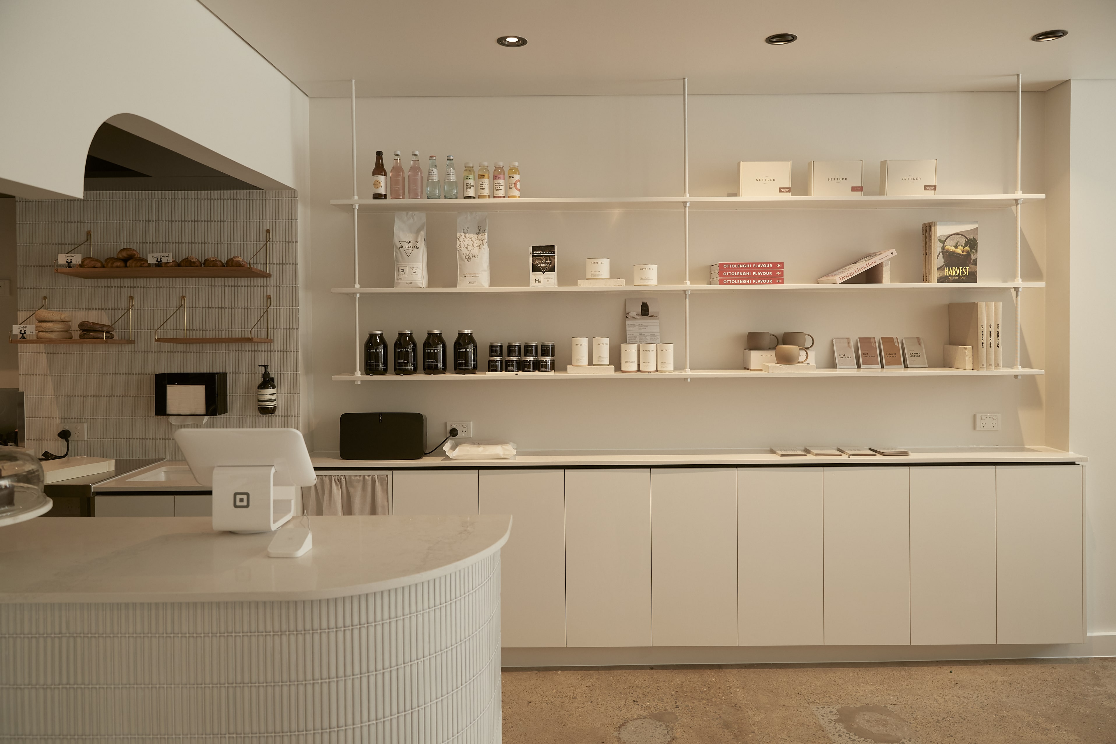 Bathed in white and flooded with natural light, the modest backdrop allows the visual merchandising of curated product to make full impact. A rustic timber dining setting anchors the space, connecting the cafe and store, fostering a welcoming and relaxing atmosphere. Effortlessly cool and perfectly undone, the linen sheers soften the window display, filtering the light that pours into the space via the large frameless glass portal. Combined, the brand, offering, product and spatial all intertwine, informing a wholistic dining and shopping experience.
